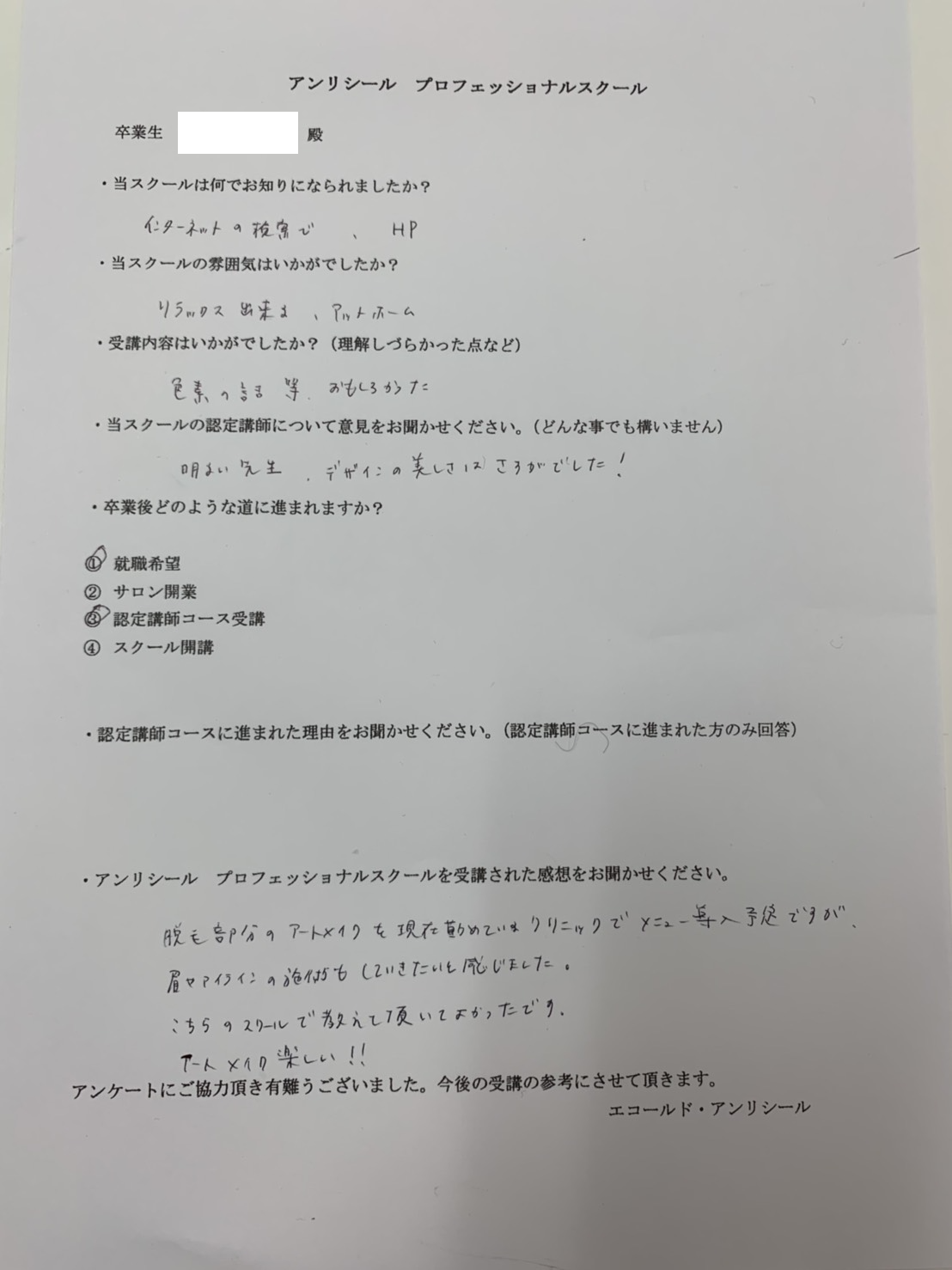 たくさんある中で選んだ理由は、マンツーマンで教えて頂けること、 アットホームな雰囲気で、多くの技術を教えて頂ける事、そして初めて問い合わせさせて頂いた時の丁寧 な対応を聞いて、ここで習いたいと思ったからです。 技術はもちろん、カウンセリング方法や理論、アフターケアまでしっかり教えて頂きました。 レッスン終了後も、開業するにあたってのアドバイスや解らない事があった時すぐに相談に乗ってもらえるので本当に安心して、挑戦することが出来ました。